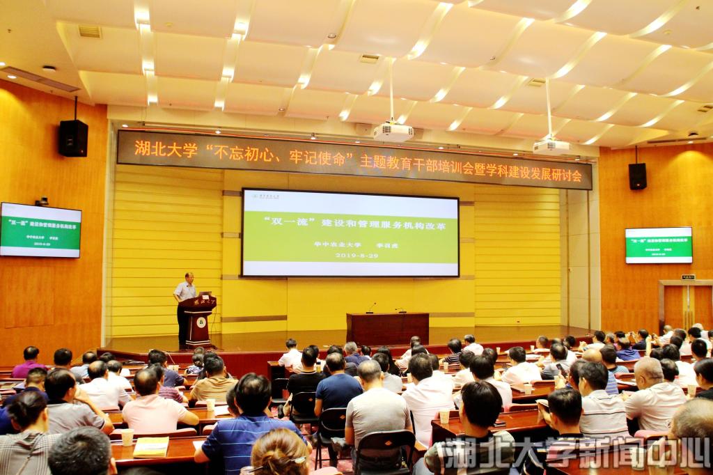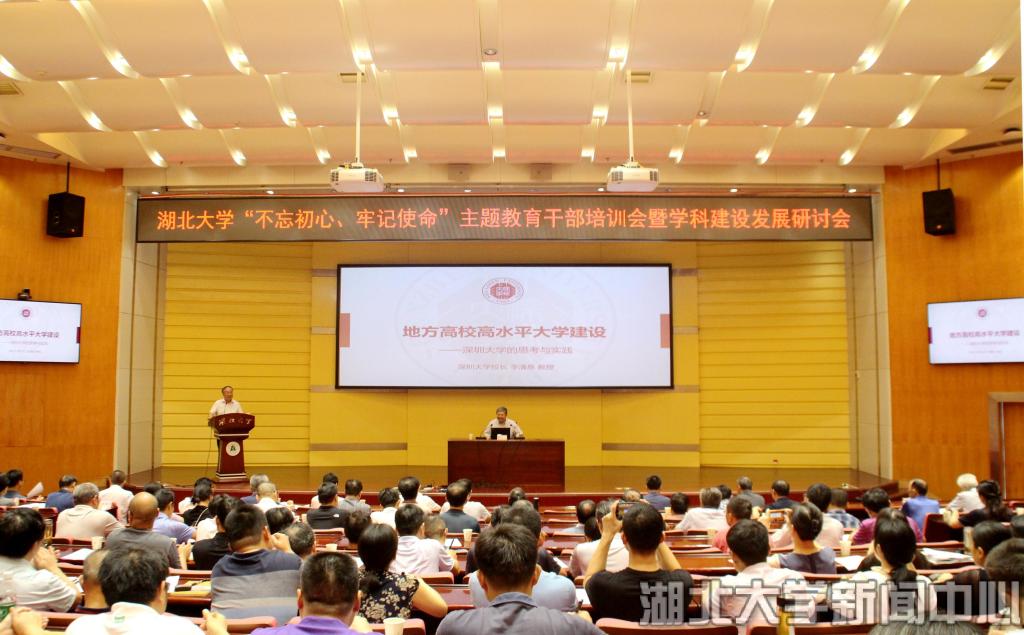 校长谢红星作主题报告。他指出,“不忘初心、牢记使命”主题教育,要提高政治站位,坚持正确办学方向,坚持“立德树人”根本任务,立足湖北,扎根中国大地,办人民满意的教育。学校建设与发展,必须保持战略定力,遵循教育规律,日拱一卒,久久为功。要全力推进“双一流”建设,并以此为抓手,精准研判,大胆施策,带动学校各项事业全面发展;要深化人才培养改革,始终把人才培养作为学校的核心与根本,坚持以本为本,推进四个回归,立足我校师范教育的传统优势,加强对人才培养的全方位审视与思考;要突破人事人才工作制度瓶颈,制定出符合国家人才政策、适应湖大实际的人才培养与使用体系,以人才“活水”推动湖大活力;要优化管理再造服务,全面实行管理重心下移,提高精细化程度和行政效率,鼓励教师干部敢作为、善作为、能作为。他强调,扁平化管理和干部执行力十分重要,要提倡“学院办大学,院长当校长”理念,尊重各学院办学实际,鼓励各学院积极探索符合自身的特色发展方略,学校侧重配套做好平台建设和相关服务工作,有效提升管理运用的执行力与和谐度。他希望全体湖大人‍‍求真务实,团结一心,砥砺奋进,勇于作为,推动学校发展再上新台阶。